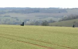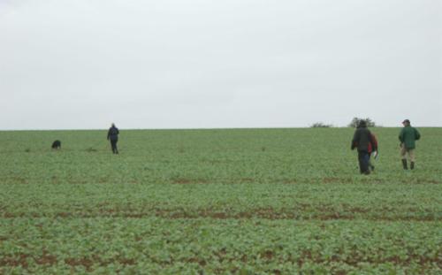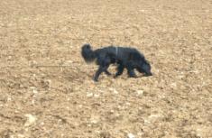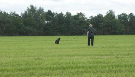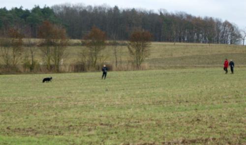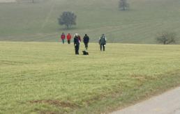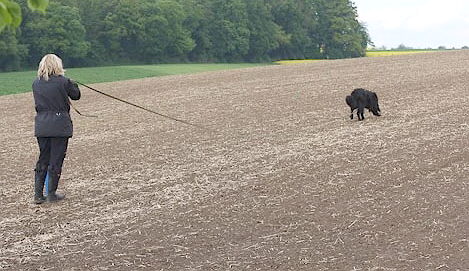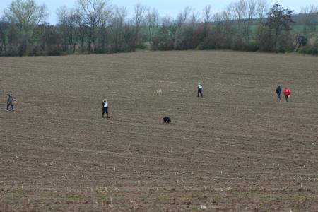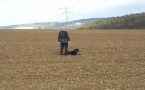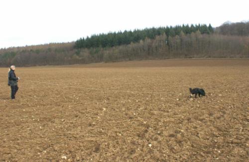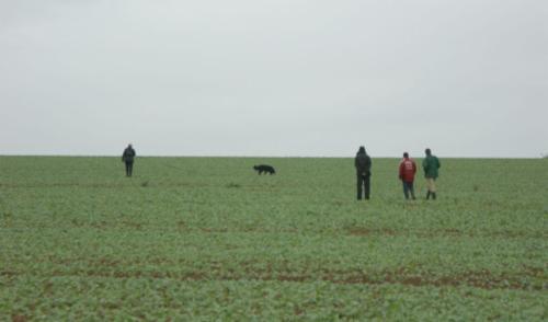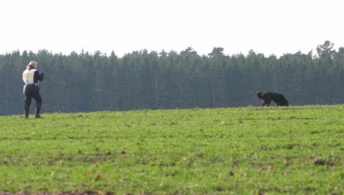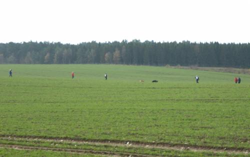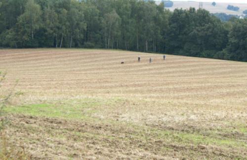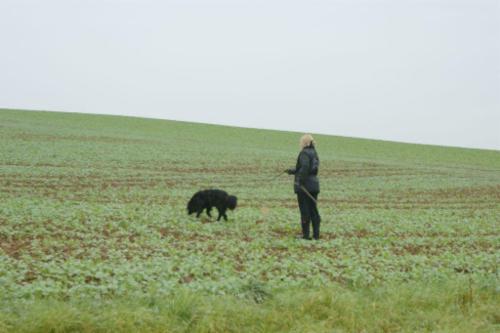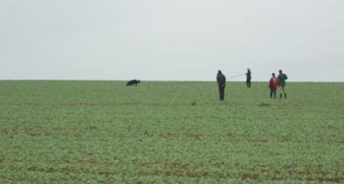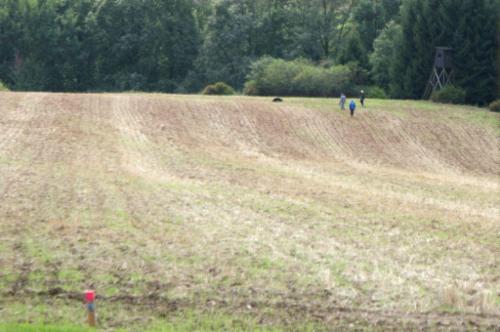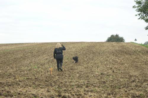 Alina´s erste Fährte am Tag 1 lag in dem Gelände, wo schon 2 Hunde vor ihr aufgeben mußten (trockener strohiger umgeworfener Acker und dazu viel Wind):