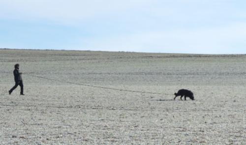 Wiederum hatte Bolena die folgende Fährte, die auf etwas härteren, komplett blanken und staubtrockenen Acker gelegt war, zu bewältigen und musste hier ihre ganze Erfahrung mit einbringen. LR Helge Ludwig bewertete diese ..."intensive Suchleistung... mit stets tiefer Nase..." mit tollen 95 Punkten.